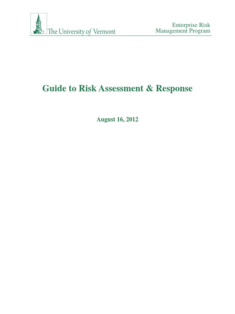 Any individual at any level of the institution may use this guide to assess and plan responses to risks and opportunities in their area. For the most part, however, risk assessments at UVM will be conducted along three primary pathways: 1) As part of UVMs annual ERM process, responsible officials (deans, vice presidents, directors, or other senior officials designated as responsible for a risk) will be asked to identify and assess the institutional-level risks and opportunities for which they are responsible. 2) UVM senior management or trustees may choose to conduct a risk assessment of a planned, institutional, strategic initiative to inform decision-making. 3) Vice presidents, deans, directors, or other senior officials may, at their option, conduct a risk assessment for their area that considers college-, school-, division-, or department-level risks in addition to institutional-level issues. Results of all risk assessments and response plans are collected by ERM staff in the Office of the Vice President of Finance & Administration (UVMs Chief Risk Officer) and entered in the Universitys risk database to facilitate monitoring and reporting.