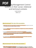 that individuals are exposed to a socialization process that instils in them a set of skills and values. This socialization process may relate to groups, such as professions (i.e. doctors or accountants), or groups within organisations which form some other kind of boundary, such as an organisational unit or division. Clan controls work by establishing values and beliefs through the ceremonies and rituals of the clan. Merchant and Van der Stede (2007) discuss personnel controls. These include selection and placement, training and job design, as well as provision of the necessary resources. We include selection (and known selection criteria) under cultural controls. Conversely, placement can be associated with organisational, and occasionally with governance structure. Training can be included in administrative controls, as this typically involves teaching individuals to follow the specied policies and procedures. Training can also be included in cultural controls as training can be seen as a way of managing organisational culture. Job design can be considered an administrative control, whereas the provision of the necessary resources is not really a control mechanism; it is merely a prerequisite for proper work and does not provide direction as such. The provision of resources can be linked back to providing sufcient information to allow proper decision-making. 4.6. Why this typology? Returning to the typology represented in Fig. 1. Cultural controls are pictured at the top to indicate that they are broad, yet subtle controls. They are assumed to be slow to change, thus, providing a contextual frame for other controls. In the middle of the gure are the planning, cybernetic, and reward and compensation controls. These are assumed to be tightly linked in many contemporary organisations, and are presented in temporal order from left to right. At the bottom are administrative controls which create the structure in which planning, cybernetic, and rewards and compensation control are exercised. While a number of conceptions of an MCS package have appeared in accounting research over the last three decades (for example, Fisher, 1995; Flamholtz et al., 1985; Otley, 1980; Simons, 1995), they either omit key MCSs that managers have available to them, or do not make a sufciently clear distinction between decision-support systems and MCS. Our proposed typology starts from the idea that control is about managers ensuring that the behaviour of employees (or some other relevant party, such as a collaborating organisation) is consistent with the organisations objectives and strategy. It is structured around how control is exercised and, as such, it broadly maps the tools, systems and practices managers have available to formally and informally direct employee behaviour. In establishing the tools and systems managers have available to direct behaviour, our typology contains more recent developments in MCS design (such as hybrids like the BSC), and includes forms of control that have received less attention in empirical research, such as cultural control. Some MCS typologies start from a principle that all MCS operate under the cybernetic principle. While we recognise that cybernetic control is important in an MCS package (and we are specic about the types of cybernetic controls available), we include other forms of control available to managers, such as administrative controls. Furthermore, our typology includes organisational structure. Many accounting researchers have treated this as a contingent variable, but we consider it to be a control mechanism; as it is something managers can use and alter in the process of control. A number of MCS typologies are not clear about the difference between information systems for decision-making and MCS. We exclude pure decision-support systems. While information systems may have an inuence on behaviour, they are not specically designed to hold organisation members accountable for their behaviour, nor do they relate behaviour to targets. An MCS typology, such as the one presented in this paper, cannot be too narrow as there is a risk that some controls may go unnoticed and existing links to other controls may obscure the research ndings. Conversely, a typology needs to be parsimonious enough to create boundaries for an empirical inquiry. We hope that the typology set out in Fig. 1 will help researchers to question the potential linkages between systems and will stimulate discussion and research in this area. Over time, further research should reveal the missing and unnecessary elements in it. 5. Paper reections When we rst decided to send out the call for papers for this special issue we were motivated by the fact that little empirical research has addressed the issue of MCS as a package of controls, and this contrasted with the research experiences of ourselves and others, which suggested that organisations use large and complex combinations of MCS.