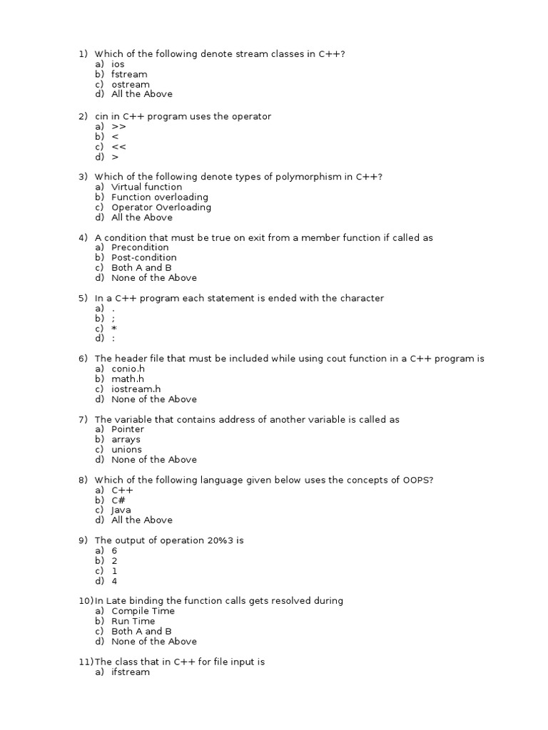 3) Which of the following denote types of polymorphism in C++? a) Virtual function b) Function overloading c) Operator Overloading d) All the Above 4) A condition that must be true on exit from a member function if called as a) Precondition b) Post-condition c) Both A and B d) None of the Above 5) In a C++ program each statement is ended with the character a) . b) ; c) * d) : 6) The header file that must be included while using cout function in a C++ program is a) conio.h b) math.h c) iostream.h d) None of the Above 7) The variable that contains address of another variable is called as a) Pointer b) arrays c) unions d) None of the Above 8) Which of the following language given below uses the concepts of OOPS? a) C++ b) C# c) Java d) All the Above 9) The output of operation 20%3 is a) 6 b) 2 c) 1 d) 4 10) In Late binding the function calls gets resolved during a) Compile Time b) Run Time c) Both A and B d) None of the Above 11) The class that in C++ for file input is a) ifstream