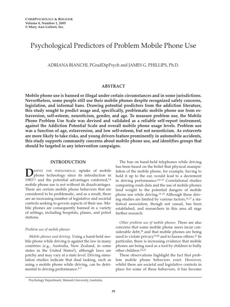 Psychological Predictors of Problem Mobile Phone Use: Adriana Bianchi, Pgraddippsych and James G. Phillips, PH.D
