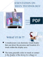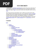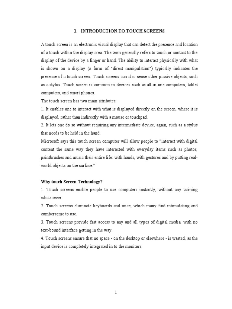 INTRODUCTION TO TOUCH SCREENS A touch screen is an electronic visual display that can detect the presence and location of a touch within the display area. The term generally refers to touch or contact to the display of the device by a finger or hand. The ability to interact physically with what is shown on a display (a form of "direct manipulation") typically indicates the presence of a touch screen. Touch screens can also sense other passive objects, such as a stylus. Touch screen is common in devices such as all-in-one computers, tablet computers, and smart phones. The touch screen has two main attributes: 1. It enables one to interact with what is displayed directly on the screen, where it is displayed, rather than indirectly with a mouse or touchpad. 2. It lets one do so without requiring any intermediate device, again, such as a stylus that needs to be held in the hand. Microsoft says this touch screen computer will allow people to interact with digital content the same way they have interacted with everyday items such as photos, paintbrushes and music their entire life: with hands, with gestures and by putting realworld objects on the surface. Why touch Screen Technology? 1. Touch screens enable people to use computers instantly, without any training whatsoever. 2. Touch screens eliminate keyboards and mice, which many find intimidating and cumbersome to use. 3. Touch screens provide fast access to any and all types of digital media, with no text-bound interface getting in the way. 4. Touch screens ensure that no space - on the desktop or elsewhere - is wasted, as the input device is completely integrated in to the monitors.