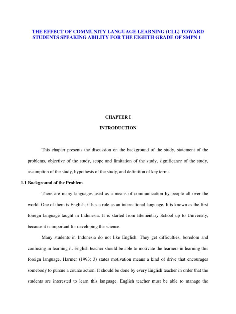 1.7 Hypothesis of the Study A hypothesis is a statement of the research assumption about the relationship between two variables that the researcher plans to test within the framework of the researcher study (Kumar, 1993: 9). From the above opinion, the researcher hypothesize that CLL is effective toward students speaking ability at eight year students of SMPN 1 Suralaga.