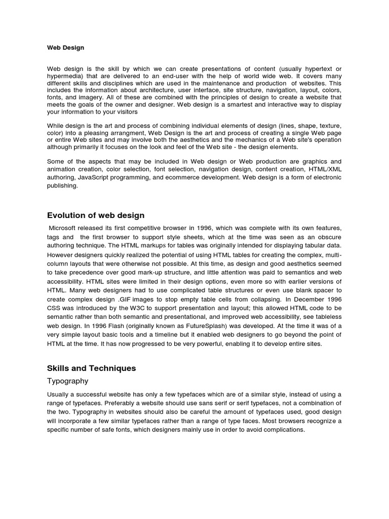 Web design is the skill by which we can create presentations of content (usually hypertext or hypermedia) that are delivered to an end-user with the help of world wide web. It covers many different skills and disciplines which are used in the maintenance and production of websites. This includes the information about architecture, user interface, site structure, navigation, layout, colors, fonts, and imagery. All of these are combined with the principles of design to create a website that meets the goals of the owner and designer. Web design is a smartest and interactive way to display your information to your visitors While design is the art and process of combining individual elements of design (lines, shape, texture, color) into a pleasing arrangment, Web Design is the art and process of creating a single Web page or entire Web sites and may involve both the aesthetics and the mechanics of a Web site's operation although primarily it focuses on the look and feel of the Web site - the design elements. Some of the aspects that may be included in Web design or Web production are graphics and animation creation, color selection, font selection, navigation design, content creation, HTML/XML authoring, JavaScript programming, and ecommerce development. Web design is a form of electronic publishing.