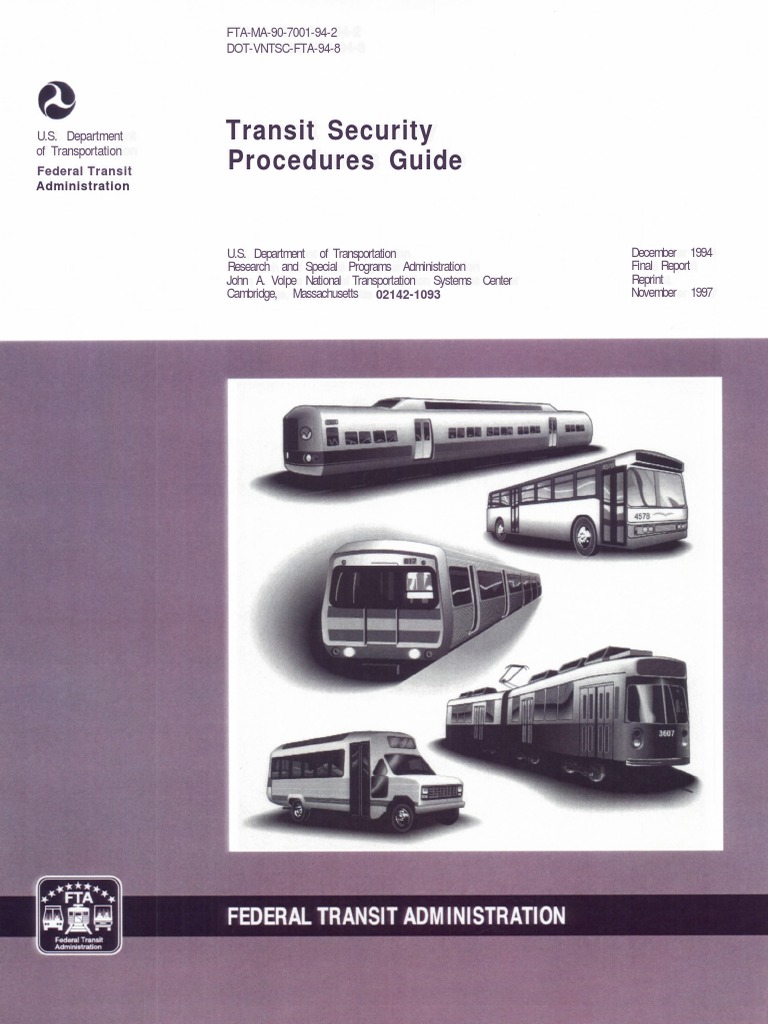 13. ABSTRACT (Maximum 200 words) The Federal Transit Administrations Safety and Security Program goal is to achieve the highest practical level of safety in all modes of transit. In order to protect passengers, employees, revenue, and property, all transit systems are encouraged to identify, evaluate, and adopt security procedures which are most efficient and effective in local practice. Both proactive and response procedures should be included along with methodologies for reviewing their efficacy in actual use. This Guide is designed to help transit systems become aware of the procedures used across the country by transit and other programs in their security tasks. The Guide includes information on how to apply the systems approach to transit security planning and implementation; proactive materials on the prevention of security incidents; procedures for immediate and follow-up response to security incidents; and specific evaluations of a variety of special security problems including crimes against passengers, crimes against the transit system, crimes against the public (hostages, hijacking, bomb threats), and general security issues. The evaluations include information on the most important attributes of each security problem: severity, frequency, type, areas of affect, when, locations, contributing factors; solution areas, solutions/approaches. personnel cost, facility/equipment cost, effectiveness, and application. This is a companion to an earlier document entitled Transit System Security Program Planning Guide which is also available from Volpe and FTA