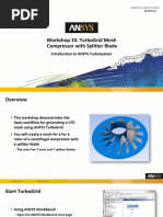 Tutorials 4.6. Generating the Mesh ...................................................................................................................... 30 4.7. Analyzing the Mesh ........................................................................................................................ 30 4.8. Saving the Mesh ............................................................................................................................. 31 4.9. Saving the State (Optional) ............................................................................................................. 31 5. Axial Fan Using ATM Optimized Topology ............................................................................................ 33 5.1. Before You Begin ............................................................................................................................. 34 5.2. Starting ANSYS TurboGrid ............................................................................................................... 34 5.3. Defining the Geometry ................................................................................................................... 34 5.4. Defining the Topology .................................................................................................................... 36 5.5. Increasing the Mesh Density ........................................................................................................... 37 5.6. Generating the Mesh ...................................................................................................................... 38 5.7. Using the Locking Feature ............................................................................................................... 39 5.8. The Y+ Functionality ....................................................................................................................... 39 5.9. Using Local Mesh Refinement ......................................................................................................... 40 5.10. Analyzing the Mesh ...................................................................................................................... 41 5.11. Adding Inlet and Outlet Domains .................................................................................................. 42 5.12. Analyzing the New Mesh ............................................................................................................... 42 5.13. Saving the Mesh ........................................................................................................................... 42 5.14. Saving the State (Optional) ............................................................................................................ 42 6. Axial Fan Using Traditional Topology ................................................................................................... 43 6.1. Before You Begin ............................................................................................................................. 44 6.2. Starting ANSYS TurboGrid ............................................................................................................... 44 6.3. Defining the Geometry ................................................................................................................... 44 6.4. Defining the Topology .................................................................................................................... 47 6.5. Reviewing the Mesh Data Settings .................................................................................................. 48 6.6. Reviewing the Mesh Quality on the Hub and Shroud Tip Layers ....................................................... 48 6.6.1. Modifying the Shroud Tip Layer .............................................................................................. 48 6.7. Adding Intermediate Layers ............................................................................................................ 49 6.8. Generating the Mesh ...................................................................................................................... 50 6.9. Analyzing the Mesh ........................................................................................................................ 50 6.10. Adding Inlet and Outlet Domains .................................................................................................. 51 6.11. Regenerating the Mesh ................................................................................................................. 51 6.12. Analyzing the New Mesh ............................................................................................................... 51 6.13. Saving the Mesh ........................................................................................................................... 52 6.14. Saving the State (Optional) ............................................................................................................ 52 7. Splitter Blades ....................................................................................................................................... 53 7.1. Before You Begin ............................................................................................................................. 54 7.2. Starting ANSYS TurboGrid ............................................................................................................... 54 7.3. Defining the Geometry ................................................................................................................... 55 7.4. Defining the Topology .................................................................................................................... 55 7.5. Reviewing the Topology Settings .................................................................................................... 55 7.6. Reviewing the Mesh Data Settin