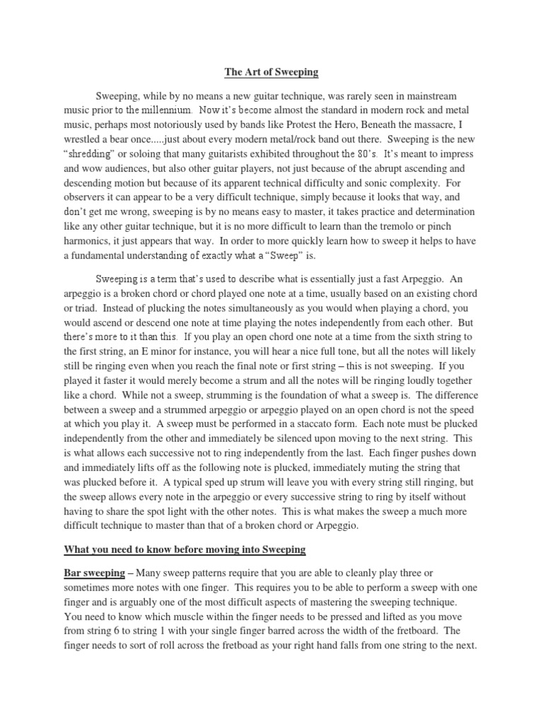 to the millennium. Now its become almost the standard in modern rock and metal music, perhaps most notoriously used by bands like Protest the Hero, Beneath the massacre, I wrestled a bear once.....just about every modern metal/rock band out there. Sweeping is the new shredding or soloing that many guitarists exhibited throughout the 80s. Its meant to impress and wow audiences, but also other guitar players, not just because of the abrupt ascending and descending motion but because of its apparent technical difficulty and sonic complexity. For observers it can appear to be a very difficult technique, simply because it looks that way, and dont get me wrong, sweeping is by no means easy to master, it takes practice and determination like any other guitar technique, but it is no more difficult to learn than the tremolo or pinch harmonics, it just appears that way. In order to more quickly learn how to sweep it helps to have a fundamental understanding of exactly what a Sweep is. Sweeping is a term thats used to describe what is essentially just a fast Arpeggio. An arpeggio is a broken chord or chord played one note at a time, usually based on an existing chord or triad. Instead of plucking the notes simultaneously as you would when playing a chord, you would ascend or descend one note at time playing the notes independently from each other. But theres more to it than this. If you play an open chord one note at a time from the sixth string to the first string, an E minor for instance, you will hear a nice full tone, but all the notes will likely still be ringing even when you reach the final note or first string this is not sweeping. If you played it faster it would merely become a strum and all the notes will be ringing loudly together like a chord. While not a sweep, strumming is the foundation of what a sweep is. The difference between a sweep and a strummed arpeggio or arpeggio played on an open chord is not the speed at which you play it. A sweep must be performed in a staccato form. Each note must be plucked independently from the other and immediately be silenced upon moving to the next string. This is what allows each successive not to ring independently from the last. Each finger pushes down and immediately lifts off as the following note is plucked, immediately muting the string that was plucked before it. A typical sped up strum will leave you with every string still ringing, but the sweep allows every note in the arpeggio or every successive string to ring by itself without having to share the spot light with the other notes. This is what makes the sweep a much more difficult technique to master than that of a broken chord or Arpeggio. What you need to know before moving into Sweeping Bar sweeping Many sweep patterns require that you are able to cleanly play three or sometimes more notes with one finger. This requires you to be able to perform a sweep with one finger and is arguably one of the most difficult aspects of mastering the sweeping technique. You need to know which muscle within the finger needs to be pressed and lifted as you move from string 6 to string 1 with your single finger barred across the width of the fretboard. The finger needs to sort of roll across the fretboad as your right hand falls from one string to the next.