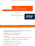 append(?List1, ?List2, ?List3) Succeeds when List3 unifies with the concatenation of List1 and List2. append(?ListOfLists, ?List) Concatenate a list of lists. Is true if Lists is a list of lists, and List is the concatenation of these lists. member(?Elem, ?List) Succeeds when Elem can be unified with one of the members of List. nextto(?X, ?Y, ?List) Succeeds when Y immediatly follows X in List. delete(+List1, ?Elem, ?List2) Delete all members of List1 that simultaneously unify with Elem and unify the result with List2. select(?Elem, ?List, ?Rest) Select Elem from List leaving Rest. It behaves as member/2, returning the remaining elements in Rest. nth0(?Index, ?List, ?Elem) Succeeds when the Index-th element of List unifies with Elem. Counting starts at 0. nth1(?Index, ?List, ?Elem) Succeeds when the Index-th element of List unifies with Elem. Counting starts at 1. last(?List, ?Elem) Succeeds if Elem unifies with the last element of List. reverse(+List1, -List2) Reverse the order of the elements in List1 and unify the result with the elements of List2. permutation(?List1, ?List2) Permuation is true when List1 is a permutation of List2. flatten(+List1, -List2) Transform List1, possibly holding lists as elements into a flat list by replacing each list with its elements (recursively). Example: ?- flatten([a, [b, [c, d], e]], X). X = [a, b, c, d, e] sumlist(+List, -Sum) Unify Sum to the result of adding all elements in List. max_list(+List, -Max) True if Max is the largest number in List. See also the function max/2. min_list(+List, -Min) True if Min is the smallest number in List. See also the function min/2. numlist(+Low, +High, -List) If Low and High are integers with Low =<Lig High, unify List to a list 20/22 Antoni eza Prolog