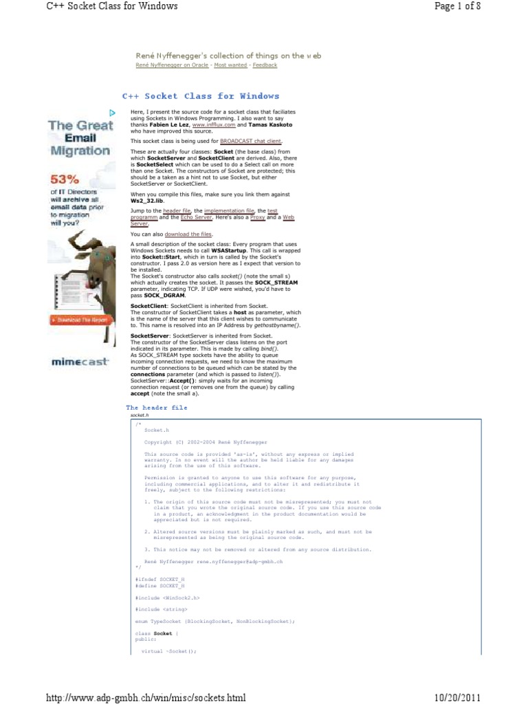 Here, I present the source code for a socket class that faciliates using Sockets in Windows Programming. I also want to say thanks Fabien Le Lez, www.infflux.com and Tamas Kaskoto who have improved this source. This socket class is being used for BROADCAST chat client. These are actually four classes: Socket (the base class) from which SocketServer and SocketClient are derived. Also, there is SocketSelect which can be used to do a Select call on more than one Socket. The constructors of Socket are protected; this should be a taken as a hint not to use Socket, but either SocketServer or SocketClient. When you compile this files, make sure you link them against Ws2_32.lib. Jump to the header file, the implementation file, the test programm and the Echo Server. Here's also a Proxy and a Web Server. You can also download the files. A small description of the socket class: Every program that uses Windows Sockets needs to call WSAStartup. This call is wrapped into Socket::Start, which in turn is called by the Socket's constructor. I pass 2.0 as version here as I expect that version to be installed. The Socket's constructor also calls socket() (note the small s) which actually creates the socket. It passes the SOCK_STREAM parameter, indicating TCP. If UDP were wished, you'd have to pass SOCK_DGRAM. SocketClient: SocketClient is inherited from Socket. The constructor of SocketClient takes a host as parameter, which is the name of the server that this client wishes to communicate to. This name is resolved into an IP Address by gethostbyname(). SocketServer: SocketServer is inherited from Socket. The constructor of the SocketServer class listens on the port indicated in its parameter. This is made by calling bind(). As SOCK_STREAM type sockets have the ability to queue incoming connection requests, we need to know the maximum number of connections to be queued which can be stated by the connections parameter (and which is passed to listen()). SocketServer::Accept(): simply waits for an incoming connection request (or removes one from the queue) by calling accept (note the small a).
