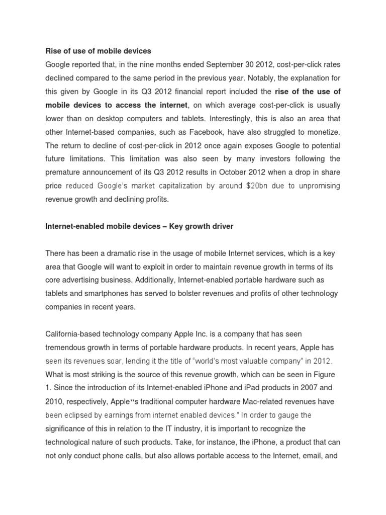 declined compared to the same period in the previous year. Notably, the explanation for this given by Google in its Q3 2012 financial report included the rise of the use of mobile devices to access the internet, on which average cost-per-click is usually lower than on desktop computers and tablets. Interestingly, this is also an area that other Internet-based companies, such as Facebook, have also struggled to monetize. The return to decline of cost-per-click in 2012 once again exposes Google to potential future limitations. This limitation was also seen by many investors following the premature announcement of its Q3 2012 results in October 2012 when a drop in share price reduced Googles market capitalization by around $20bn due to unpromising revenue growth and declining profits. Internet-enabled mobile devices Key growth driver