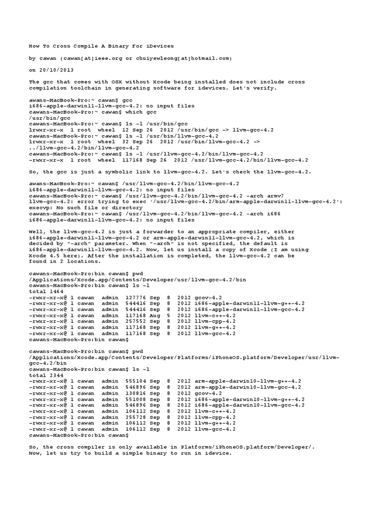 com) on 20/10/2013 The gcc that comes with OSX without Xcode being installed does not include cross compilation toolchain in generating software for idevices. Let's verify. awans-MacBook-Pro:~ cawan$ gcc i686-apple-darwin11-llvm-gcc-4.2: cawans-MacBook-Pro:~ cawan$ which /usr/bin/gcc cawans-MacBook-Pro:~ cawan$ ls -l lrwxr-xr-x 1 root wheel 12 Sep cawans-MacBook-Pro:~ cawan$ ls -l lrwxr-xr-x 1 root wheel 32 Sep ../llvm-gcc-4.2/bin/llvm-gcc-4.2 cawans-MacBook-Pro:~ cawan$ ls -l -rwxr-xr-x 1 root wheel 117168 no input files gcc /usr/bin/gcc 26 2012 /usr/bin/gcc -> llvm-gcc-4.2 /usr/bin/llvm-gcc-4.2 26 2012 /usr/bin/llvm-gcc-4.2 -> /usr/llvm-gcc-4.2/bin/llvm-gcc-4.2 Sep 26 2012 /usr/llvm-gcc-4.2/bin/llvm-gcc-4.2