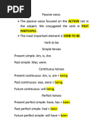 Passive Form In passive sentences, the thing receiving the action is the subject of the sentence and the thing doing the action is optionally included near the end of the sentence. You can use the passive form if you think that the thing receiving the action is more important or should be emphasized. You can also use the passive form if you do not know who is doing the action or if you do not want to mention who is doing the action. [Thing receiving action] + [be] + [past participle of verb] + [by] + [thing doing action]