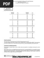 General comments Items 2, 3, 5, 6, 25 and 27 were found easiest by the candidates. The most difficult items were items 11, 12, 18, 24, 28, 29, 33 and 36; of these, item 12 and item 28 were found the most taxing. Comments on specific questions Item 1 on speed/time graphs presented few with a problem the constant speed section between V and W was by far the most popular distractor, candidates probably thinking of the graph as showing distance/time. Almost all responses to the straightforward measurement item 2 were correct. In item 3, a number of candidates opted for C, forgetting that a measurement of mass is also needed. In item 4 on density, a quarter of candidates chose A, being the block with the smallest volume and therefore the most dense material. Item 5 involved a speed calculation, and the only significant mistake was to divide speed by time to arrive at option A. A few misread the question in item 6, choosing C (as the only option with no resultant force). Item 7 caused more problems; a significant number believed that the measured length was plotted on the y-axis, despite the fact that the graph line started at zero. The balance item 8 was well answered. Distractor A was popular in the moments item 9; it is worth stressing that equilibrium requires no resultant