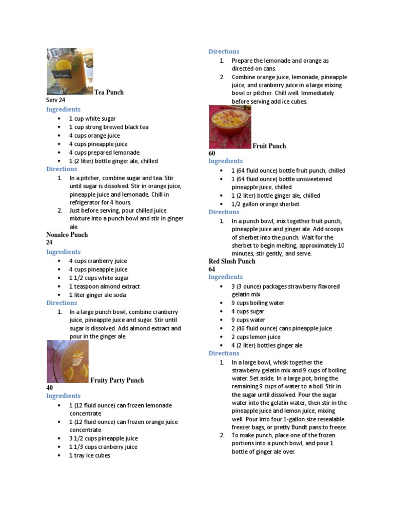 Fruit Punch 60 Ingredients 1 (64 fluid ounce) bottle fruit punch, chilled 1 (64 fluid ounce) bottle unsweetened pineapple juice, chilled 1 (2 liter) bottle ginger ale, chilled 1/2 gallon orange sherbet Directions 1. In a punch bowl, mix together fruit punch, pineapple juice and ginger ale. Add scoops of sherbet into the punch. Wait for the sherbet to begin melting, approximately 10 minutes, stir gently, and serve. Red Slush Punch 64 Ingredients 3 (3 ounce) packages strawberry flavored gelatin mix 9 cups boiling water 4 cups sugar 9 cups water 2 (46 fluid ounce) cans pineapple juice 2 cups lemon juice 4 (2 liter) bottles ginger ale Directions 1. In a large bowl, whisk together the strawberry gelatin mix and 9 cups of boiling water. Set aside. In a large pot, bring the remaining 9 cups of water to a boil. Stir in the sugar until dissolved. Pour the sugar water into the gelatin water, then stir in the pineapple juice and lemon juice, mixing well. Pour into four 1-gallon size resealable freezer bags, or pretty Bundt pans to freeze. 2. To make punch, place one of the frozen portions into a punch bowl, and pour 1 bottle of ginger ale over.
