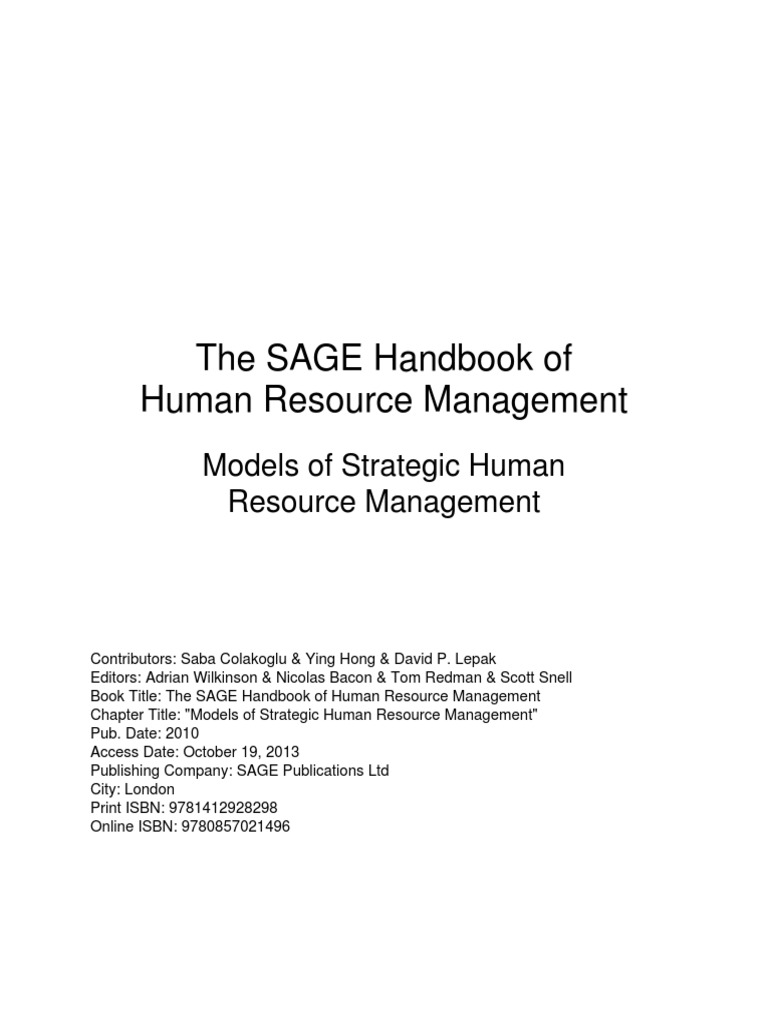 Contributors: Saba Colakoglu & Ying Hong & David P. Lepak Editors: Adrian Wilkinson & Nicolas Bacon & Tom Redman & Scott Snell Book Title: The SAGE Handbook of Human Resource Management Chapter Title: "Models of Strategic Human Resource Management" Pub. Date: 2010 Access Date: October 19, 2013 Publishing Company: SAGE Publications Ltd City: London Print ISBN: 9781412928298 Online ISBN: 9780857021496
