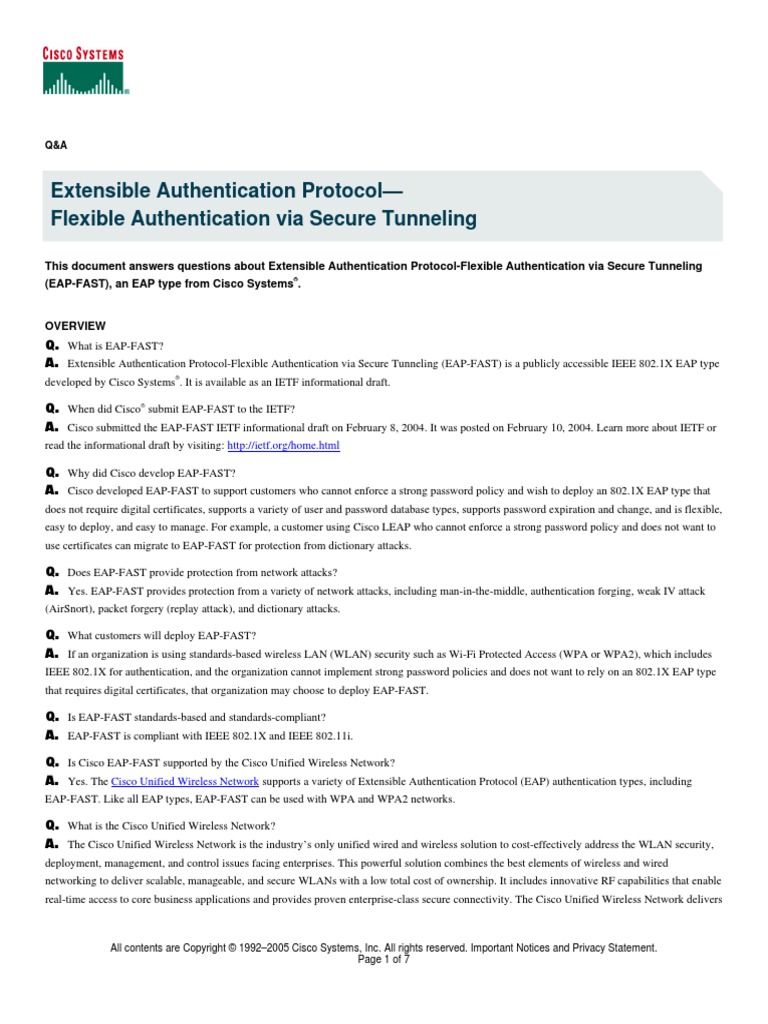 Q. What is EAP-FAST? A. Extensible Authentication Protocol-Flexible Authentication via Secure Tunneling (EAP-FAST) is a publicly accessible IEEE 802.1X EAP type