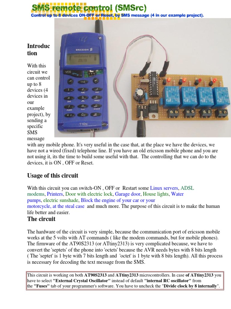 When you finish the circuit connect it to the mobile phone, turn on the phone and then power on the circuit, not before . The AVR will try to read the message from the 1st memory location of the phone, for that I suggest you to delete all SMS messages from the phone before you connect it to the circuit. If there is no message to the 1st memory location, the AVR is trying again until you sent any. The format of the message must be only '1' or '0'. '1' to enable, or '0' to disable the device. The message must have only 8 numbers, '1' or '0' , alone or mixed . Example: if you send the message 11000100 then you enable, starting from the right, the devices 3,7,8 ('1') and disabling the devices 1,2,4,5,6 ('0') . If you want to send a new message and you don't want to change some device, must send the same number as the old message. Example: If you want to enable only the 5th device, you must send a new message like 11010100 to keep the other devices as there are (we send the same message as the old ( 11000100 ) and we change only the 5th bit from '0' to '1' to enable the device ).