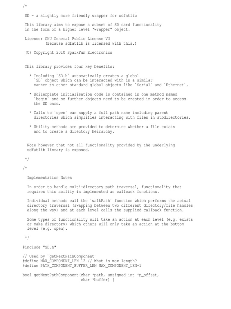 of a higher level "wrapper" object. License: GNU General Public License V3 (Because sdfatlib is licensed with this.) (C) Copyright 2010 SparkFun Electronics This library provides four key benefits: * Including `SD.h` automatically creates a global `SD` object which can be interacted with in a similar manner to other standard global objects like `Serial` and `Ethernet`. * Boilerplate initialisation code is contained in one method named `begin` and no further objects need to be created in order to access the SD card. * Calls to `open` can supply a full path name including parent directories which simplifies interacting with files in subdirectories. * Utility methods are provided to determine whether a file exists and to create a directory heirarchy. Note however that not all functionality provided by the underlying sdfatlib library is exposed. */ /* Implementation Notes In order to handle multi-directory path traversal, functionality that requires this ability is implemented as callback functions. Individual methods call the `walkPath` function which performs the actual directory traversal (swapping between two different directory/file handles along the way) and at each level calls the supplied callback function. Some types of functionality will take an action at each level (e.g. exists or make directory) which others will only take an action at the bottom level (e.g. open). */ #include "SD.h" // Used by `getNextPathComponent` #define MAX_COMPONENT_LEN 12 // What is max length? #define PATH_COMPONENT_BUFFER_LEN MAX_COMPONENT_LEN+1 bool getNextPathComponent(char *path, unsigned int *p_offset, char *buffer) {