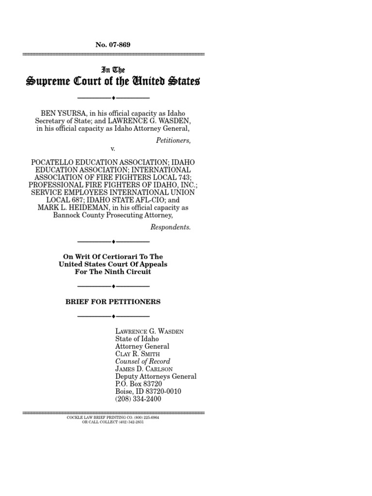 vii TABLE OF AUTHORITIES Continued Page Smylie v. Williams, 81 Idaho 335, 341 P.2d 451 (1959) .........................................................................9 Thompson v. Engelking, 96 Idaho 793, 537 P.2d 635 (1975) ..................................................................9 United Pub. Workers v. Mitchell, 330 U.S. 75 (1947) .......................................................................33 United States Civil Serv. Commn v. Natl Assn of Letter Carriers, 413 U.S. 548 (1973)...................34 USPS v. Council of Greenburgh Civic Assns, 453 U.S. 114 (1981) .................................................18 Utah Education Association v. Shurtleff, 512 F.3d 1254 (10th Cir. 2008), pet. for rehg filed, No. 06-4142 (Jan. 22, 2008) ....................................54 Washington v. Seattle Sch. Dist., 458 U.S. 457 (1982) .................................................................51, 52 Wisconsin Public Intervenor v. Mortier, 501 U.S. 597 (1991) .....................................52, 53, 54 UNITED STATES CONSTITUTION U.S. Const. amend. I .......................................... passim U.S. Const. amend. XI ..........................................12, 54 UNITED STATES CODE 7 U.S.C. 136v(a) .......................................................52 28 U.S.C. 1254(1) .......................................................1 29 U.S.C. 151, et seq..................................................8