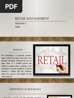 1.1 1.2 1.3 1.4 INTRODUCTION LEARNING OBJECTIVES DEFINITION OF RETAILING IMPORTANCE OF RETAILING 1.4.1 Consumers Perspective 1.4.2 Contribution to the Economy 1.4.3 Manufactures/Wholesalers Perspective CHARACTERISTICS OF RETAILING 1.5.1 Sales to Final Consumers 1.5.2 Small Average Sales 1.5.3 Impulse Purchases 1.5.4 Consumers Preference to Visit Stores TRADITIONAL AND NON TRADITIONAL RETAILING 1.6.1 Size 1.6.2 Location 1.6.3 Ambience 1.6.4. Assortment 1.6.5 Knowledge of Consumer 1.6.6 Home Delivery 1.6.7 Cost RETAIL MANAGEMENT PROCESS: AN OVERVIEW 1.7.1 Retail Mission and Vision 1.7.2 Situational Analysis 1.7.3 Retail Strategy 1.7.4 Target Marketing 1.7.5 Selection of the Location 1.7.6 Financial Operations Management 1.7.7 Merchandise and Logistics Management 1.7.8 Human Resource Management 1.7.9 Retail Tactics 1.7.10 Evaluation and Control