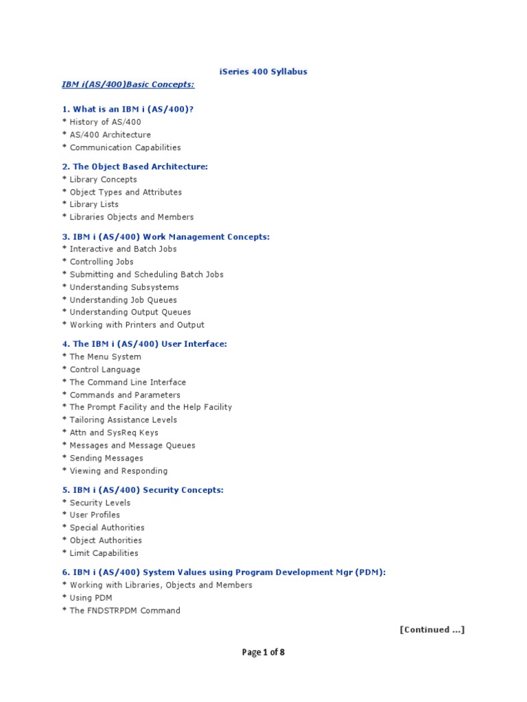 * History of AS/400 * AS/400 Architecture * Communication Capabilities 2. The Object Based Architecture: * Library Concepts * Object Types and Attributes * Library Lists * Libraries Objects and Members 3. IBM i (AS/400) Work Management Concepts: * Interactive and Batch Jobs * Controlling Jobs * Submitting and Scheduling Batch Jobs * Understanding Subsystems * Understanding Job Queues * Understanding Output Queues * Working with Printers and Output 4. The IBM i (AS/400) User Interface: * The Menu System * Control Language * The Command Line Interface * Commands and Parameters * The Prompt Facility and the Help Facility * Tailoring Assistance Levels * Attn and SysReq Keys * Messages and Message Queues * Sending Messages * Viewing and Responding 5. IBM i (AS/400) Security Concepts: * Security Levels * User Profiles * Special Authorities * Object Authorities * Limit Capabilities 6. IBM i (AS/400) System Values using Program Development Mgr (PDM): * Working with Libraries, Objects and Members * Using PDM * The FNDSTRPDM Command [Continued ]