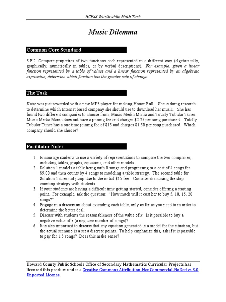 1. Are there restraints that could effect Katies decision? 2. Is there a point where both music companies would cost the same amount? Why is this important for a consumer to know? 3. What considerations need to go into Katies decision? 4. What strategies did you use to find you answer? 5. How are the strategies the groups used to solve similar? 6. How are the strategies the groups used to solve unique? 7. What connections did you make to the problem?
