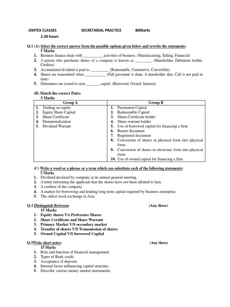 Q.1 (A) Select the correct answer form the possible options given below and rewrite the statements: 5 Marks 1. Business finance deals with ___________activities of business. (Manufacturing, Selling, Financial) 2. A person who purchases shares of a company is known as _________ (Shareholder, Debenture holder,