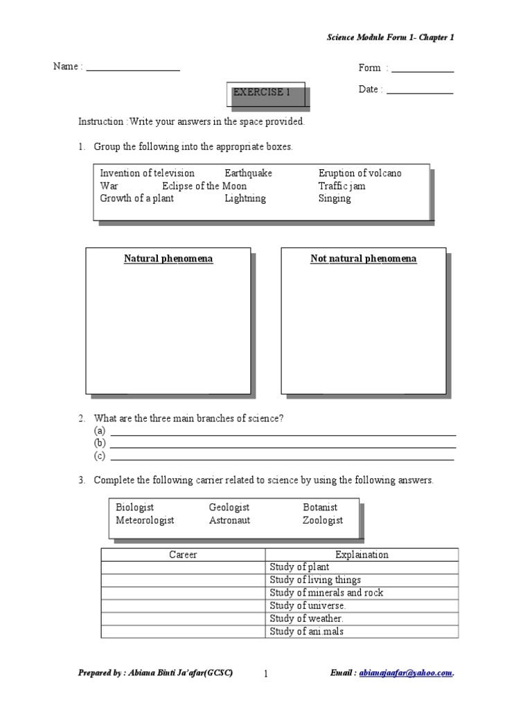 Name : EXERCISE 2 Section A 1. What are natural phenomena? A. Things that happen in nature. B. Things that created by scientists. C. Things that happen everyday around us. D. Things that are needed for living things to live. 2. Science is the knowledge about A. Living things B. Curing diseases C. Natural phenomena D. Things made by humans. 3. Which of the following is not a field of studies in science? A. Biology B. Chemistry C. Astronomy D. Accountancy 4. Which of the following is not a laboratory safety rule? A. Students are not allowed to play in the laboratory. B. Students are not allowed to eat or drink in the laboratory. C. Students are encouraged to carry out experiments on their own creativity. D. Students must report any breakage of glass apparatus in the laboratory to the teacher immediately.
