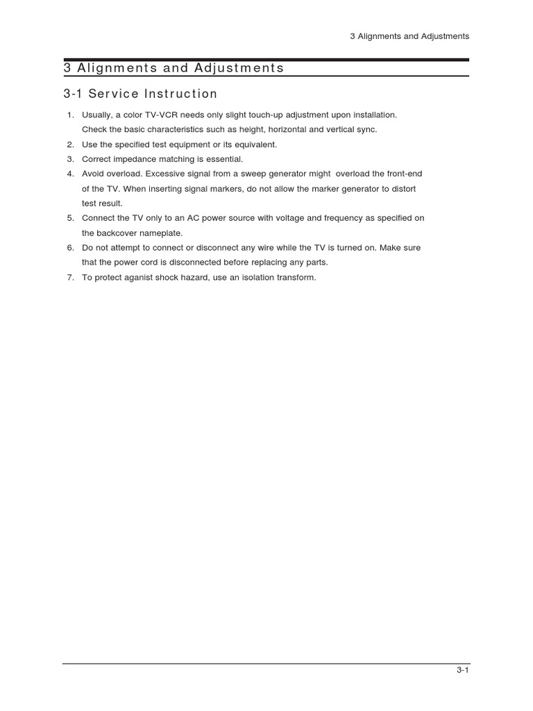 1. Usually, a color TV-VCR needs only slight touch-up adjustment upon installation. Check the basic characteristics such as height, horizontal and vertical sync. 2. Use the specified test equipment or its equivalent. 3. Correct impedance matching is essential. 4. Avoid overload. Excessive signal from a sweep generator might overload the front-end of the TV. When inserting signal markers, do not allow the marker generator to distort test result. 5. Connect the TV only to an AC power source with voltage and frequency as specified on the backcover nameplate. 6. Do not attempt to connect or disconnect any wire while the TV is turned on. Make sure that the power cord is disconnected before replacing any parts. 7. To protect aganist shock hazard, use an isolation transform.