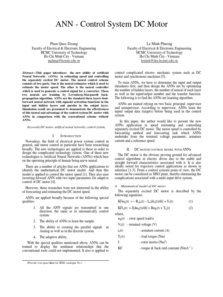 I. INTRODUCTION Nowadays, the field of electrical power system control in general, and motor control in particular have been researching broadly. The new technologies are applied to these in order to design the complicated technology system. One of these new technologies is Artificial Neural Networks (ANNs) which base on the operating principle of human being nerve neural. There are a number of articles that use ANNs applications to identify the mathematical DC motor model. And then this model is applied to control the motor speed [1]. They also uses inverting forward ANN with two input parameters for adaptive control of DC motor [4]. However, these researches were not interested in the ability of forecasting and estimating the DC motor speed. ANNs are applied broadly because of the following special qualities: 1. All the ANN signals are transmitted in one direction, the same as in automatically control system. The ability of ANNs to learn the sample. The ability to creating the parallel signals Analog as well as in the discrete system. The adaptive ability. in