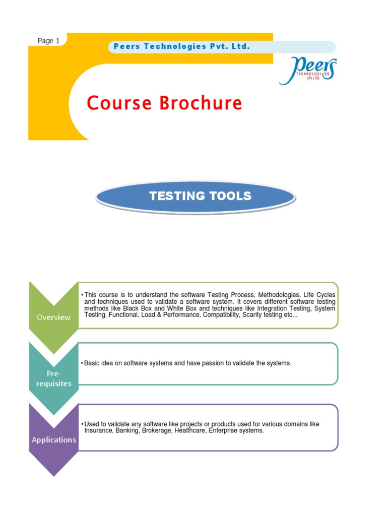 The document is a course brochure for a software testing tools course. The course covers software testing methodologies, life cycles, and techniques. It teaches various testing methods like black box and white box testing. The course contents include topics like quality assurance concepts, software development life cycles, testing techniques, test management with HP Quality Center, performance testing with LoadRunner, and introduction to automation testing with QTP. The QTP section covers topics like implementing GUI tests, checkpoints, data-driven testing, file operations, and integration with other tools.
