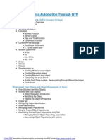 INTRODUCTION TO AUTOMATION TESTING Understanding what is Automation Testing and Need of Automation Introducing different areas of automation (Functional, Load, Test Management) Difference between manual testing and Automation testing Prerequisites for QTP Introduction to QTP tool and discussion on various version of QTP TESTING PROCESS OF QTP Understanding the Test Process of QTP Discussion on the various components of QTP window like test pane, Test details pane, Active screen, Data table, Information and missing Resources window Discussion on the keyword view and Expert view Understanding different toolbars and window themes(MS office 2000, XP, Office 2003, MS.Net 2005) IMPLEMENTING GUI AND BITMAP REGRESSION TEST Understanding the Add-in manager Working with Automation Record and Run setting Working with File settings Working with Tools options