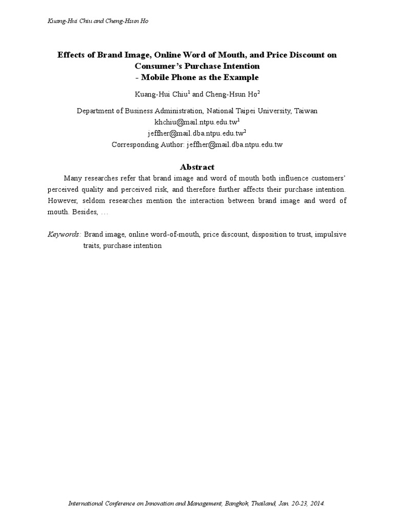 )an resear#hes refer that 'rand image and !ord of mouth 'oth influen#e #ustomers* per#eived +ualit and per#eived ris", and therefore further affe#ts their pur#hase intention% Ho!ever, seldom resear#hes mention the intera#tion 'et!een 'rand image and !ord of mouth% Besides, , Keywords: Brand image, online !ord-of-mouth, pri#e dis#ount, disposition to trust, impulsive traits, pur#hase intention