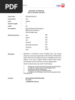 STUDENT PERFORMANCE OBJECTIVES: Without references or notes, within a limited time (3 hours total for each exam session), independently perform the following tasks. Multiple re-tries are allowed on mastery (100% accuracy) objectives, each with a dierent set of problems: Program and connect a PLC to control an electromagnetic relay with 100% accuracy (mastery) Sketch proper wire connections for sourcing or sinking PLC I/O points given schematic or pictorial diagrams of the components, with 100% accuracy (mastery) Determine status of a PLC discrete output given input states and a simple RLL program, with 100% accuracy (mastery) Calculate either the full-load current or the horsepower of an electric motor (either single- or threephase) given the line voltage and one of the other parameters Solve for specied variables in algebraic formulae, with 100% accuracy (mastery) Determine the possibility of suggested faults in a simple PLC circuit given measured values (voltage, current), a schematic diagram, and reported symptoms, with 100% accuracy (mastery) Program a PLC to fulll a specied control system function In a team environment and with full access to references, notes, and instructor assistance, perform the following tasks: Demonstrate proper use of safety equipment and application of safe procedures while using power tools, and working on live systems Communicate eectively with teammates to plan work, arrange for absences, and share responsibilities in completing all labwork Construct and commission a motor start/stop system using a PLC as the control element Generate an accurate wiring diagram compliant with industry standards documenting your teams motor control system Independently perform the following tasks on a functioning PLC motor control system with 100% accuracy (mastery). Multiple re-tries are allowed with dierent specications/conditions each time): Diagnose a random fault placed in another teams PLC motor control system by the instructor within a limited time using no test equipment except a multimeter and ladder logic editing software, logically justifying your steps in the instructors direct presence COURSE OUTLINE: A course calendar in electronic format (Excel spreadsheet) resides on the Y: network drive, and also in printed paper format in classroom DMC130, for convenient student access. This calendar is updated to reect schedule changes resulting from employer recruiting visits, interviews, and other impromptu events. Course worksheets provide comprehensive lists of all course assignments and activities, with the rst page outlining the schedule and sequencing of topics and assignment due dates. These worksheets are available in PDF format at http://openbookproject.net/books/socratic/sinst INST231 Section 1 (PLC contact, coil, and counter programming): 4 days theory and labwork INST231 Section 2 (PLC timer and sequence programming): 4 days theory and labwork + 1 day for mastery/proportional Exams