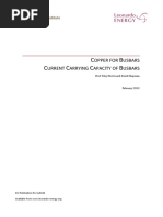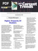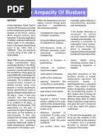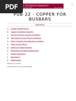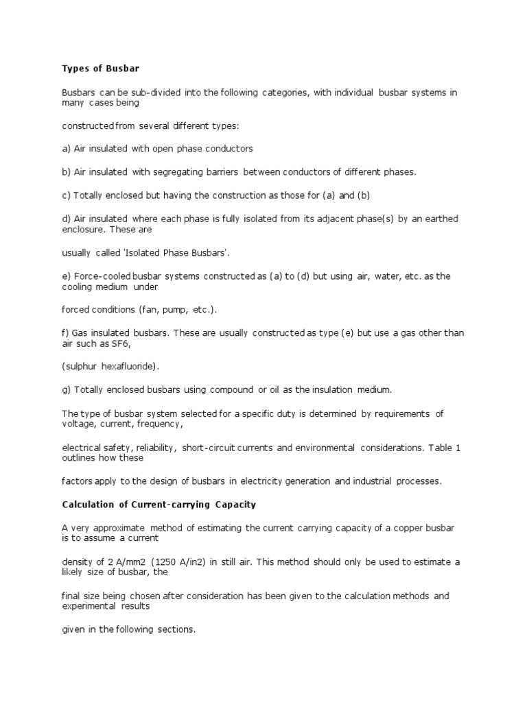being constructed from several different types: a) Air insulated with open phase conductors b) Air insulated with segregating barriers between conductors of different phases. c) Totally enclosed but having the construction as those for (a) and (b) d) Air insulated where each phase is fully isolated from its adjacent phase(s) by an earthed enclosure. These are usually called 'Isolated Phase Busbars'. e) Force-cooled busbar systems constructed as (a) to (d) but using air, water, etc. as the cooling medium under forced conditions (fan, pump, etc.). f) Gas insulated busbars. These are usually construc ted as type (e) but use a gas other than air such as SF6, (sulphur hexafluoride). g) Totally enclosed busbars using compound or oil as the insulation medium. The type of busbar system selected for a specific duty is determined by requirements of voltage, current, frequency, electrical safety, reliability, short -circuit currents and environmental considerations. Table 1 outlines how these factors apply to the design of busbars in electricity generation and industrial processes. Calculation of Current-carrying Capacity A very approximate method of estimating the current carrying capacity of a copper busbar is to assume a current density of 2 A/mm2 (1250 A/in2) in still air. This method should only be used to estimate a likely size of busbar, the final size being chosen after consideration has been given to the calculation methods and experimental results given in the following sections.