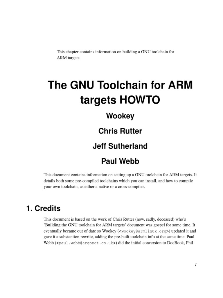 This document is based on the work of Chris Rutter (now, sadly, deceased) whos Building the GNU toolchain for ARM targets document was gospel for some time. It eventually became out of date so Wookey (<wookey@armlinux.org>) updated it and gave it a substantion rewrite, adding the pre-built toolchain info at the same time. Paul Webb (<paul.webb@argonet.co.uk>) did the initial conversion to DocBook, Phil