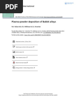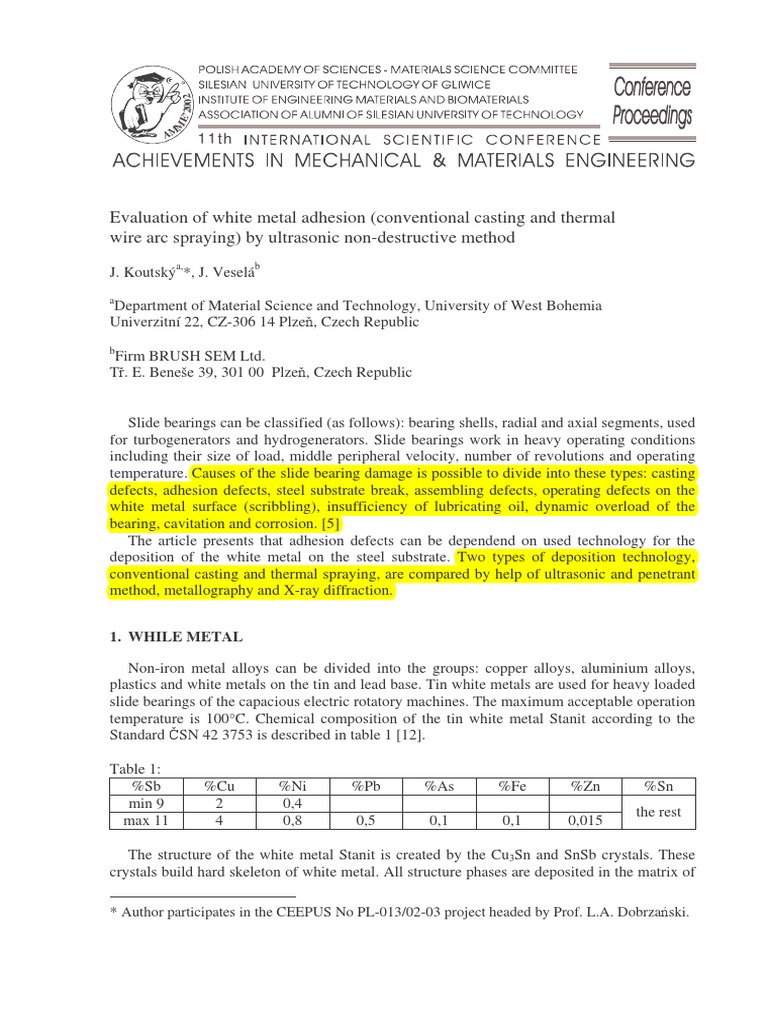 J. Koutska,*, J. Veselb Department of Material Science and Technology, University of West Bohemia Univerzitn 22, CZ-306 14 Plze , Czech Republic Firm BRUSH SEM Ltd. T . E. Benee 39, 301 00 Plze , Czech Republic Slide bearings can be classified (as follows): bearing shells, radial and axial segments, used for turbogenerators and hydrogenerators. Slide bearings work in heavy operating conditions including their size of load, middle peripheral velocity, number of revolutions and operating temperature. Causes of the slide bearing damage is possible to divide into these types: casting defects, adhesion defects, steel substrate break, assembling defects, operating defects on the white metal surface (scribbling), insufficiency of lubricating oil, dynamic overload of the bearing, cavitation and corrosion. [5] The article presents that adhesion defects can be dependend on used technology for the deposition of the white metal on the steel substrate. Two types of deposition technology, conventional casting and thermal spraying, are compared by help of ultrasonic and penetrant method, metallography and X-ray diffraction. 1. WHILE METAL Non-iron metal alloys can be divided into the groups: copper alloys, aluminium alloys, plastics and white metals on the tin and lead base. Tin white metals are used for heavy loaded slide bearings of the capacious electric rotatory machines. The maximum acceptable operation temperature is 100C. Chemical composition of the tin white metal Stanit according to the Standard SN 42 3753 is described in table 1 [12]. Table 1: %Sb min 9 max 11 %Cu 2 4 %Ni 0,4 0,8 %Pb 0,5 %As 0,1 %Fe 0,1 %Zn 0,015 %Sn the rest