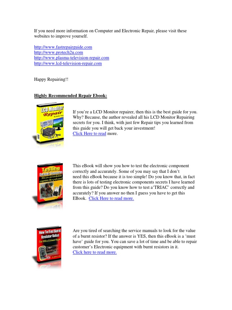 If you need more information on Computer and Electronic Repair, please visit these websites to improve yourself. http://www.fastrepairguide.com http://www.protech2u.com http://www.plasma-television-repair.com http://www.lcd-television-repair.com