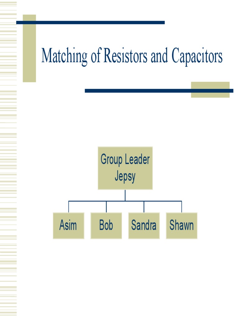 w Suppose 2 matched poly resistors having widths 2um and 4 um will have a process bias of 0.1um. This represents a systematic mismatch of no less than 2.4 %(0.512um). w If one matched resistors length is of 5um and other is 3um displays a typical mismatch on the order of 0.2%. w Approximately most processing biases should be of at least 0.1um. w But if the resistors of the above example were laid out in 20um segments then the ratio would be around 0.5um.