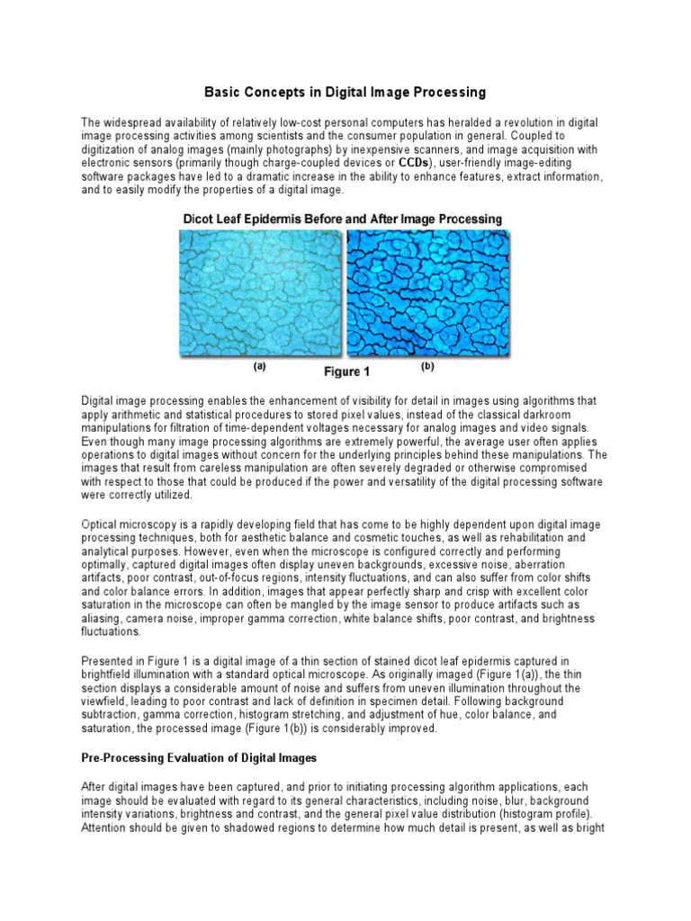 "igital image processing enables the enhancement of visibility for detail in images using algorithms that apply arithmetic and statistical procedures to stored pixel values, instead of the classical dar!room manipulations for filtration of time-dependent voltages necessary for analog images and video signals. #ven though many image processing algorithms are extremely powerful, the average user often applies operations to digital images without concern for the underlying principles behind these manipulations. The images that result from careless manipulation are often severely degraded or otherwise compromised with respect to those that could be produced if the power and versatility of the digital processing software were correctly utilized. $ptical microscopy is a rapidly developing field that has come to be highly dependent upon digital image processing techni ues, both for aesthetic balance and cosmetic touches, as well as rehabilitation and analytical purposes. %owever, even when the microscope is configured correctly and performing optimally, captured digital images often display uneven bac!grounds, excessive noise, aberration artifacts, poor contrast, out-of-focus regions, intensity fluctuations, and can also suffer from color shifts and color balance errors. &n addition, images that appear perfectly sharp and crisp with excellent color saturation in the microscope can often be mangled by the image sensor to produce artifacts such as aliasing, camera noise, improper gamma correction, white balance shifts, poor contrast, and brightness fluctuations. 'resented in (igure ) is a digital image of a thin section of stained dicot leaf epidermis captured in brightfield illumination with a standard optical microscope. *s originally imaged ((igure )(a)), the thin section displays a considerable amount of noise and suffers from uneven illumination throughout the viewfield, leading to poor contrast and lac! of definition in specimen detail. (ollowing bac!ground subtraction, gamma correction, histogram stretching, and ad+ustment of hue, color balance, and saturation, the processed image ((igure )(b)) is considerably improved. Pre-Processing Evaluation of Digital Images *fter digital images have been captured, and prior to initiating processing algorithm applications, each image should be evaluated with regard to its general characteristics, including noise, blur, bac!ground intensity variations, brightness and contrast, and the general pixel value distribution (histogram profile). *ttention should be given to shadowed regions to determine how much detail is present, as well as bright