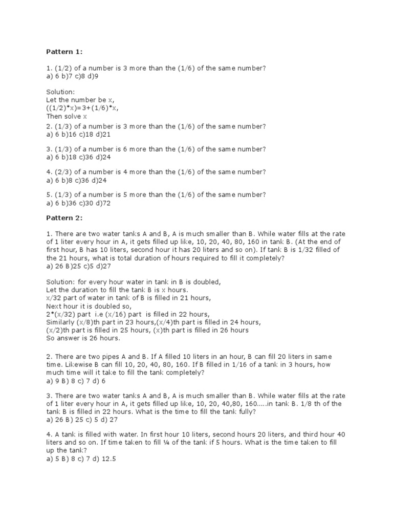 a) 6 b)7 c)8 d)9 Solution: et the number be !" ((1/2)#!)$3%(1/6)#!" &hen sol'e ! 2. (1/3) of a number is 3 more than the (1/6) of the same number? a) 6 b)16 c)18 d)21 3. (1/3) of a number is 6 more than the (1/6) of the same number? a) 6 b)18 c)36 d)2( (. (2/3) of a number is ( more than the (1/6) of the same number? a) 6 b)8 c)36 d)2( ). (1/3) of a number is ) more than the (1/6) of the same number? a) 6 b)36 c)3* d)72 Pattern 2: 1. &here are t+o +ater tan,s - and ." - is much smaller than .. /hile +ater fills at the rate of 1 liter e'er0 hour in -" it 1ets filled u2 li,e" 1*" 2*" (*" 8*" 16* in tan, .. (-t the end of first hour" . has 1* liters" second hour it has 2* liters and so on). 3f tan, . is 1/32 filled of the 21 hours" +hat is total duration of hours re4uired to fill it com2letel0? a) 26 .)2) c)) d)27 Solution: for e'er0 hour +ater in tan, in . is doubled" et the duration to fill the tan, . is ! hours. !/32 2art of +ater in tan, of . is filled in 21 hours" 5e!t hour it is doubled so" 2#(!/32) 2art i.e (!/16) 2art is filled in 22 hours" Similarl0 (!/8)th 2art in 23 hours"(!/()th 2art is filled in 2( hours" (!/2)th 2art is filled in 2) hours" (!)th 2art is filled in 26 hours So ans+er is 26 hours. 2. &here are t+o 2i2es - and .. 3f - filled 1* liters in an hour" . can fill 2* liters in same time. i,e+ise . can fill 1*" 2*" (*" 8*" 16*. 3f . filled in 1/16 of a tan, in 3 hours" ho+ much time +ill it ta,e to fill the tan, com2letel0? a) 9 .) 8 c) 7 d) 6 3. &here are t+o +ater tan,s - and ." - is much smaller than .. /hile +ater fills at the rate of 1 liter e'er0 hour in -" it 1ets filled u2 li,e" 1*" 2*" (*"8*" 16*6..in tan, .. 1/8 th of the tan, . is filled in 22 hours. /hat is the time to fill the tan, full0? a) 26 .) 2) c) ) d) 27 (. - tan, is filled +ith +ater. 3n first hour 1* liters" second hours 2* liters" and third hour (* liters and so on. 3f time ta,en to fill 7 of the tan, if ) hours. /hat is the time ta,en to fill u2 the tan,? a) ) .) 8 c) 7 d) 12.)