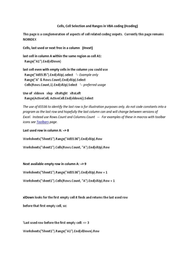snipets. Currently this page remains NOINDEX Cells, last used or next free in a column (#next) last cell in column A within the same region as cell A1: Range("A1").End(xlDown) last cell even with empty cells in the column you could use Range("A65535").End(xlUp).select '-- Example only Range("A" & Rows.Count).End(xlUp).Select Cells(Rows.Count,1).End(xlUp).Select '-- preferred usage Use of xldown xlup xltoRight xltoLeft Range(ActiveCell, ActiveCell.End(xldown)).Select The use of 65536 to identify the last row is for illustration purposes only, do not code constants into a program as the last row and hopefully the last column can and will change between versions of Excel. Instead use Rows.Count and Columns.Count -- For examples of these in macros with toolbar icons see Toolbars page. Last used row in column A: => 8 Worksheets("Sheet1").Range("A65536").End(xlUp).Row Worksheets("sheet1").Cells(Rows.Count, "A").End(xlUp).Row