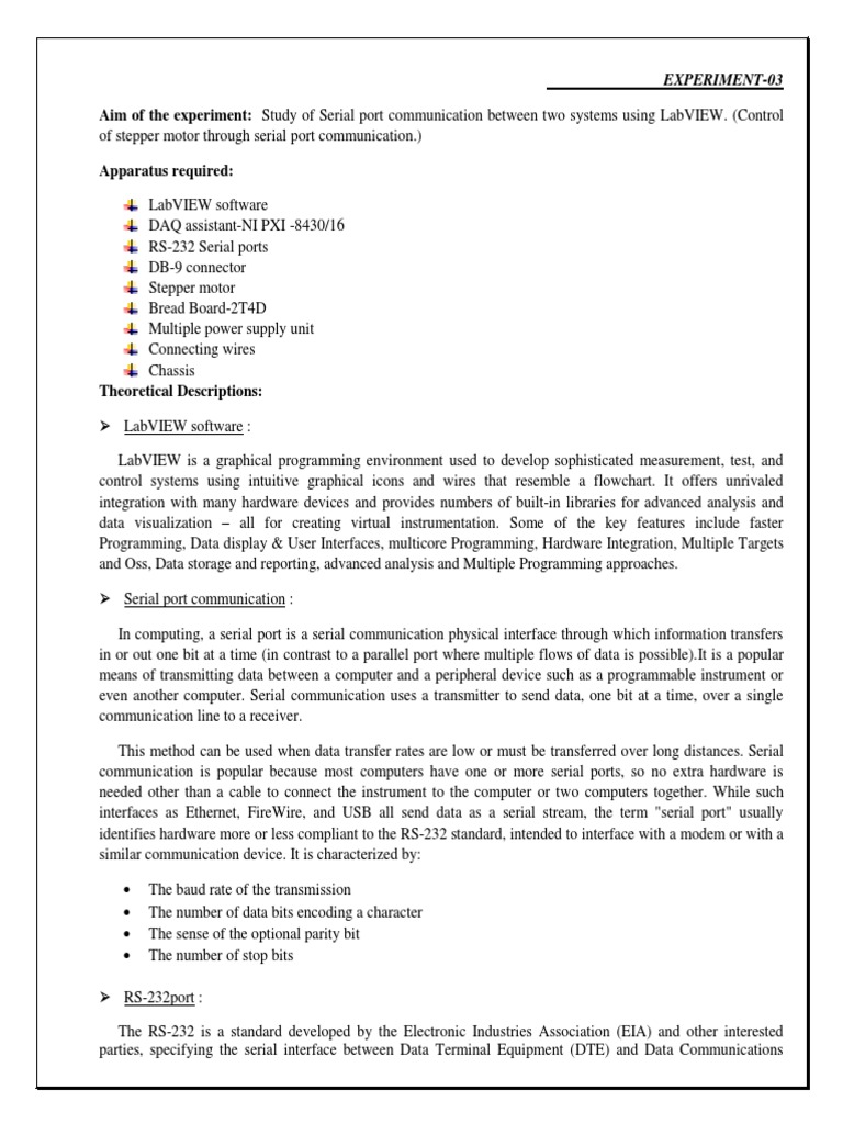 (Control of stepper motor through serial port communication.) Apparatus required: LabVIEW software DAQ assistant-NI PXI -8430/16 RS-232 Serial ports DB-9 connector Stepper motor Bread Board-2T4D Multiple power supply unit Connecting wires Chassis Theoretical Descriptions: LabVIEW software : LabVIEW is a graphical programming environment used to develop sophisticated measurement, test, and control systems using intuitive graphical icons and wires that resemble a flowchart. It offers unrivaled integration with many hardware devices and provides numbers of built-in libraries for advanced analysis and data visualization all for creating virtual instrumentation. Some of the key features include faster Programming, Data display & User Interfaces, multicore Programming, Hardware Integration, Multiple Targets and Oss, Data storage and reporting, advanced analysis and Multiple Programming approaches. Serial port communication : In computing, a serial port is a serial communication physical interface through which information transfers in or out one bit at a time (in contrast to a parallel port where multiple flows of data is possible).It is a popular means of transmitting data between a computer and a peripheral device such as a programmable instrument or even another computer. Serial communication uses a transmitter to send data, one bit at a time, over a single communication line to a receiver. This method can be used when data transfer rates are low or must be transferred over long distances. Serial communication is popular because most computers have one or more serial ports, so no extra hardware is needed other than a cable to connect the instrument to the computer or two computers together. While such interfaces as Ethernet, FireWire, and USB all send data as a serial stream, the term "serial port" usually identifies hardware more or less compliant to the RS-232 standard, intended to interface with a modem or with a similar communication device. It is characterized by: The baud rate of the transmission The number of data bits encoding a character The sense of the optional parity bit The number of stop bits
