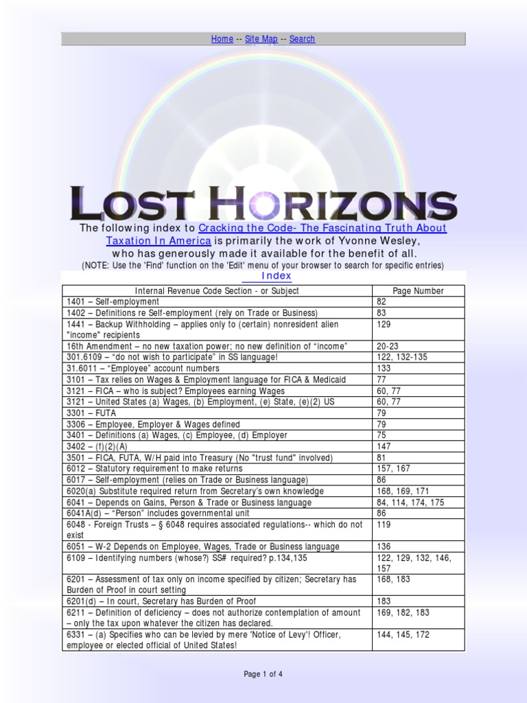 Internal Revenue Code Section - or Subject 1401 Self-employment 1402 Definitions re Self-employment (rely on Trade or Business) 1441 Backup Withholding applies only to (certain) nonresident alien "income" recipients 16th Amendment no new taxation power; no new definition of income 301.6109 do not wish to participate in SS language! 31.6011 Employee account numbers 3101 Tax relies on Wages & Employment language for FICA & Medicaid 3121 FICA who is subject? Employees earning Wages 3121 United States (a) Wages, (b) Employment, (e) State, (e)(2) US 3301 FUTA 3306 Employee, Employer & Wages defined 3401 Definitions (a) Wages, (c) Employee, (d) Employer 3402 (f)(2)(A) 3501 FICA, FUTA, W/H paid into Treasury (No "trust fund" involved) 6012 Statutory requirement to make returns 6017 Self-employment (relies on Trade or Business language) 6020(a) Substitute required return from Secretarys own knowledge 6041 Depends on Gains, Person & Trade or Business language 6041A(d) Person includes governmental unit 6048 - Foreign Trusts 6048 requires associated regulations-- which do not exist 6051 W-2 Depends on Employee, Wages, Trade or Business language 6109 Identifying numbers (whose?) SS# required? p.134,135 6201 Assessment of tax only on income specified by citizen; Secretary has Burden of Proof in court setting 6201(d) In court, Secretary has Burden of Proof 6211 Definition of deficiency does not authorize contemplation of amount only the tax upon whatever the citizen has declared. 6331 (a) Specifies who can be levied by mere 'Notice of Levy'! Officer, employee or elected official of United States!