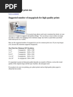 Each colored box on the right represents a certain number of megapixels. The numbers along the top and left side are print dimensions in inches at 300ppi (pixels per inch). Most books and magazines require 300ppi for photo quality. For example, the chart shows that you can make a 5" x 7" photo quality print from a 3 megapixel camera. Notice that as the print size doubles, the megapixels required increases geometrically. You can make nice 8" x 10" prints with a 6 or 8 megapixel camera, but to make a true photo quality 16" x 20" print, you need between 24 and 30 megapixels. Dont be fooled by manufacturers claims that say you can make 16" x 20" prints from an 8 megapixel camera. While you certainly can make a print that size, it will not be true photo quality. Heres why: A megapixel is 1 million pixels. Its an area measurement like square feet. A typical 8 megapixel camera produces images that are 3266 x 2450* pixels. If you multiply 3266 by 2450, you get 8,001,700 or 8 million pixels. To find the largest photo quality image you can print, divide each dimension by 300: 3266 / 300 = 10.89 inches 2450 / 300 = 8.17 inches If you are not publishing your images in a book or magazine, and youre just making prints for yourself or your friends, you can cheat. Good quality inkjet printers can make a nice looking print at 250 or 200ppi. At 200ppi, the maximum print size becomes: 3266 / 200 = 16.33 inches 2450 / 200 = 12.25 inches If you know how to use image editing software like Photoshop, you can cheat even more by increasing the image size, and even doubling the number of pixels in the image. The quality of the camera and lense becomes more important at this point bacause any loss of detail or sharpness is magnified. If an image is enlarged too much in this manner, it will look fuzzy or pixelated.