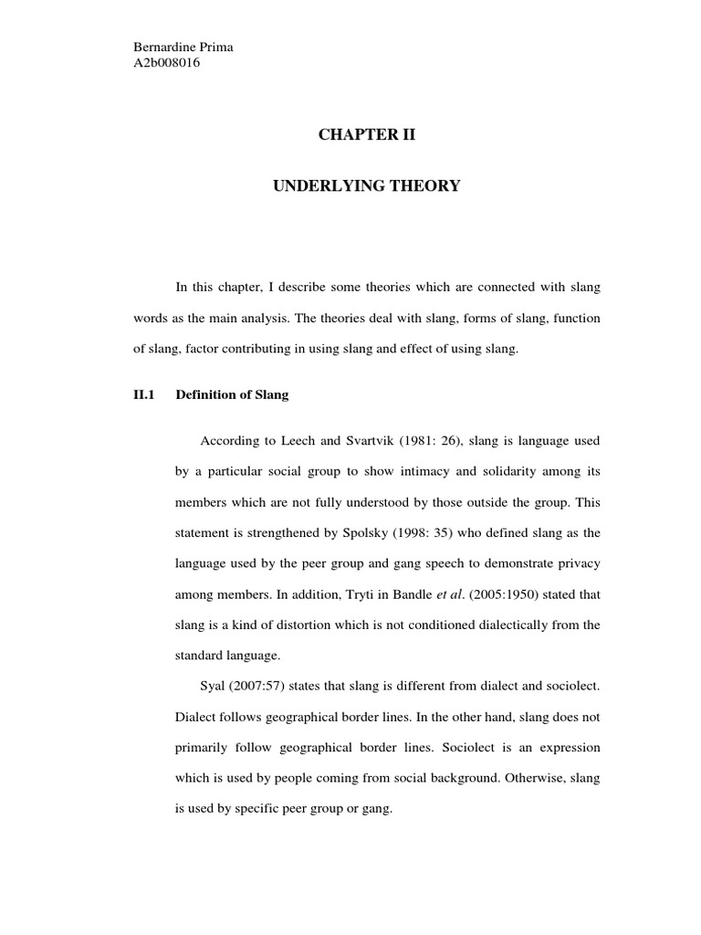 In this chapter, I describe some theories which are connected with slang words as the main analysis. The theories deal with slang, forms of slang, function of slang, factor contributing in using slang and effect of using slang.