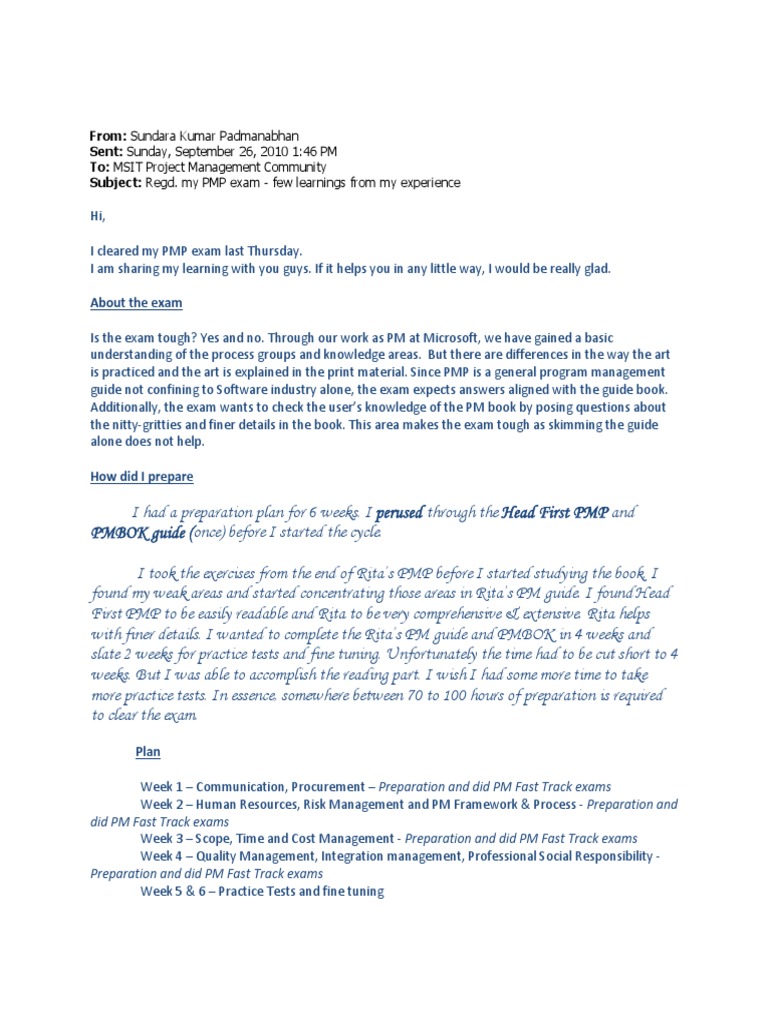 Hi, I cleared my PMP exam last Thursday. I am sharing my learning with you guys. If it helps you in any little way, I would be really glad. About the exam Is the exam tough? Yes and no. Through our work as PM at Microsoft, we have gained a basic understanding of the process groups and knowledge areas. But there are differences in the way the art is practiced and the art is explained in the print material. Since PMP is a general program management guide not confining to Software industry alone, the exam expects answers aligned with the guide book. Additionally, the exam wants to check the users knowledge of the PM book by posing questions about the nitty-gritties and finer details in the book. This area makes the exam tough as skimming the guide alone does not help. How did I prepare