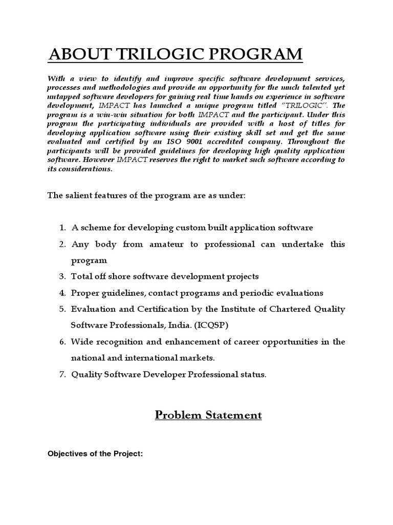 With a view to identify and improve specific software development services, processes and methodologies and provide an opportunity for the much talented yet untapped software developers for gaining real time hands on experience in software development, IMPACT has launched a unique program titled TRILOGIC. The program is a win-win situation for both IMPACT and the participant. Under this program the participating individuals are provided with a host of titles for developing application software using their existing skill set and get the same evaluated and certified by an ISO 9001 accredited company. Throughout the participants will be provided guidelines for developing high quality application software. However IMPACT reserves the right to market such software according to its considerations.