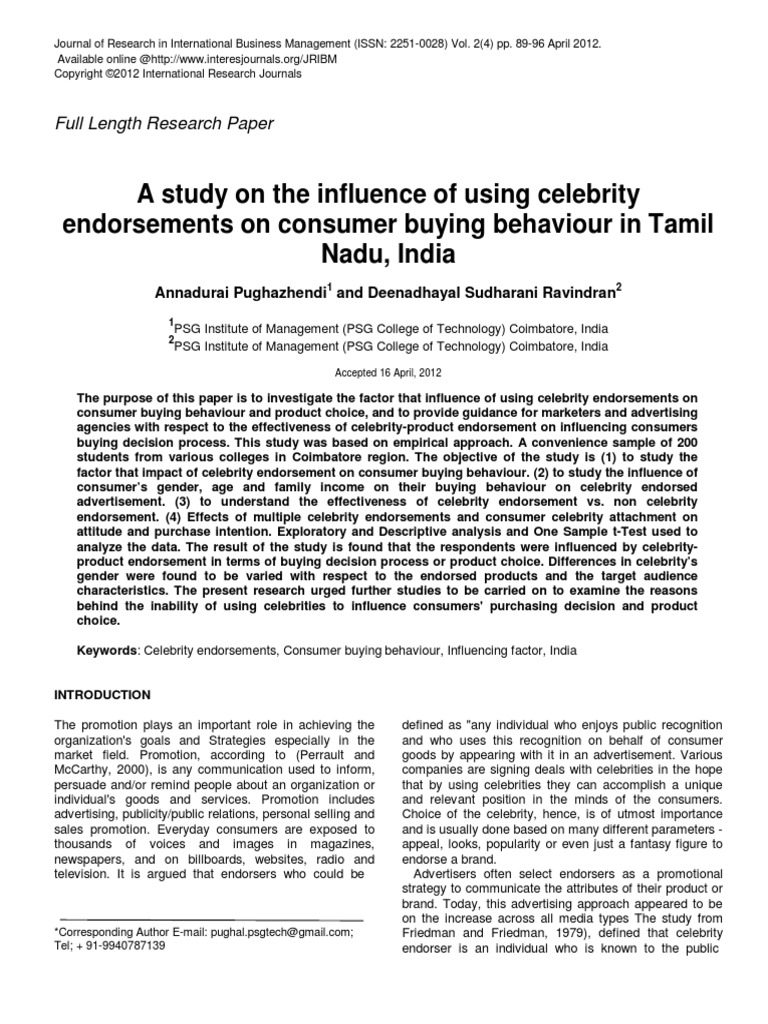 The purpose of this paper is to investigate the factor that influence of using celebrity endorsements on consumer buying behaviour and product choice, and to provide guidance for marketers and advertising agencies with respect to the effectiveness of celebrity-product endorsement on influencing consumers buying decision process. This study was based on empirical approach. A convenience sample of 200 students from various colleges in Coimbatore region. The objective of the study is (1) to study the factor that impact of celebrity endorsement on consumer buying behaviour. (2) to study the influence of consumers gender, age and family income on their buying behaviour on celebrity endorsed advertisement. (3) to understand the effectiveness of celebrity endorsement vs. non celebrity endorsement. (4) Effects of multiple celebrity endorsements and consumer celebrity attachment on attitude and purchase intention. Exploratory and Descriptive analysis and One Sample t-Test used to analyze the data. The result of the study is found that the respondents were influenced by celebrityproduct endorsement in terms of buying decision process or product choice. Differences in celebritys gender were found to be varied with respect to the endorsed products and the target audience characteristics. The present research urged further studies to be carried on to examine the reasons behind the inability of using celebrities to influence consumers' purchasing decision and product choice. Keywords: Celebrity endorsements, Consumer buying behaviour, Influencing factor, India INTRODUCTION The promotion plays an important role in achieving the organization's goals and Strategies especially in the market field. Promotion, according to (Perrault and McCarthy, 2000), is any communication used to inform, persuade and/or remind people about an organization or individual's goods and services. Promotion includes advertising, publicity/public relations, personal selling and sales promotion. Everyday consumers are exposed to thousands of voices and images in magazines, newspapers, and on billboards, websites, radio and television. It is argued that endorsers who could be defined as "any individual who enjoys public recognition and who uses this recognition on behalf of consumer goods by appearing with it in an advertisement. Various companies are signing deals with celebrities in the hope that by using celebrities they can accomplish a unique and relevant position in the minds of the consumers. Choice of the celebrity, hence, is of utmost importance and is usually done based on many different parameters appeal, looks, popularity or even just a fantasy figure to endorse a brand. Advertisers often select endorsers as a promotional strategy to communicate the attributes of their product or brand. Today, this advertising approach appeared to be on the increase across all media types The study from Friedman and Friedman, 1979), defined that celebrity endorser is an individual who is known to the public