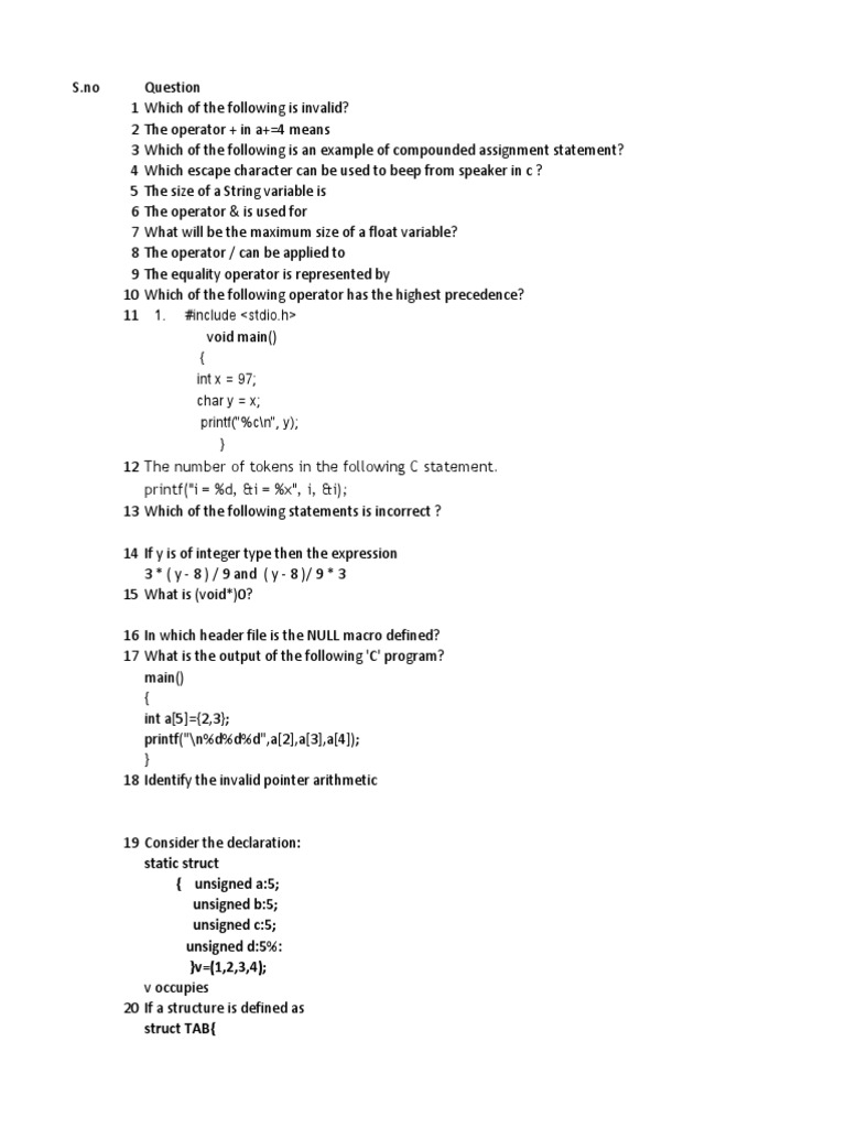 12 The number of tokens in the following C statement. printf("i = %d, &i = %x", i, &i); 13 Which of the following statements is incorrect ? 14 If y is of integer type then the expression 3 * ( y - 8 ) / 9 and ( y - 8 )/ 9 * 3 15 What is (void*)0? 16 In which header file is the NULL macro defined? 17 What is the output of the following 'C' program? main() { int a[5]={2,3}; printf("\n%d%d%d",a[2],a[3],a[4]); } 18 Identify the invalid pointer arithmetic