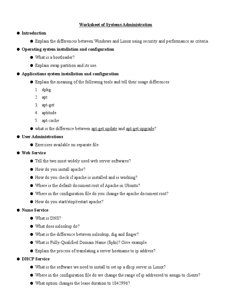 ce as criteria. Operating system installation and configuration What is a bootloader? Explain swap partition and its use. Applications system installation and configuration Explain the meaning of the following tools and tell their usage differences 1. dpkg 2. apt 3. apt get !. aptitude ". apt cache what is the difference between apt get update and apt get upgrade? User Administrations Exercises a#ailable on separate file Web Service $ell the two most widely used web ser#er softwares? %ow do you install apache? %ow do you check if apache is installed and is working? Where is the default document root of &pache in 'buntu? Where in the configuration file do you change the apache document root? %ow do you start(stop(restart apache? Name Service What is )*+? What does nslookup do? What is the difference between nslookup, dig and finger? What is -ully .ualified )omain *ame /f0dn1? 2i#e example. Explain the process of translating a ser#er hostname to ip address? DH ! Service What is the software we need to install to set up a dhcp ser#er in Linux? Where in the configuration file do we change the range of ip addressed to assign to clients? What option changes the lease duration to 13!2445?